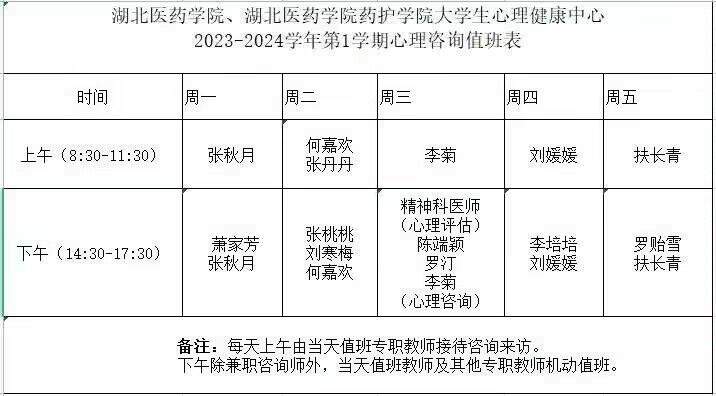 湖北医药学院、湖北医药学院药护学院大学生心理健康中心2023—2024学年第1学期心理咨询值班表