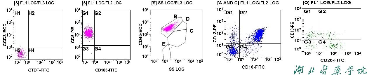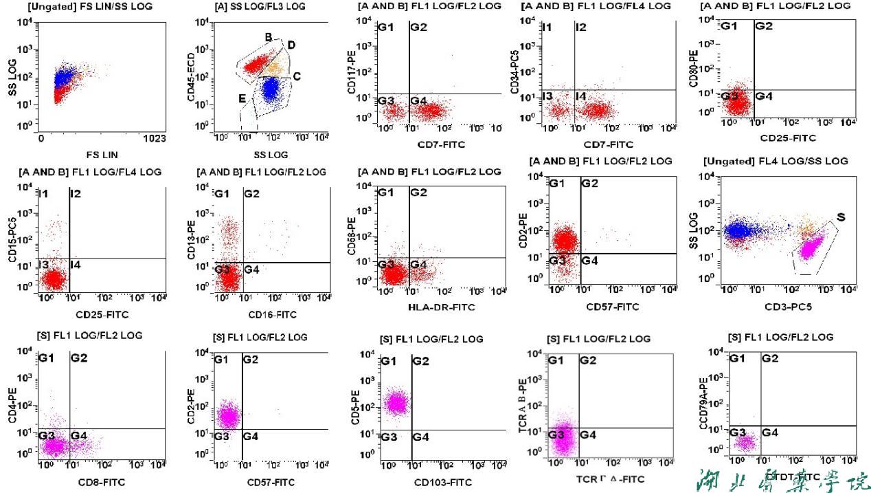 淋巴细胞群约占全部有核细胞的56.33%,比例偏高,表达CD7、CD3、CD2、CD5,少部分表达CD13、HLA-DR,不表达CD117、CD34、CD25、CD30、CD15、CD16、CD56、CD57。