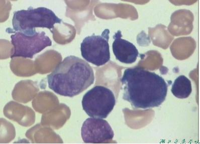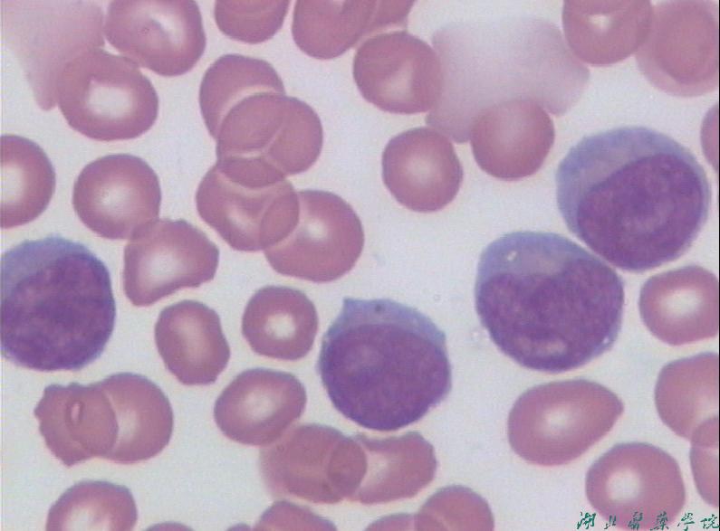 血象:70%患者有贫血和血小板减少,属于正细胞性贫血,白细胞总数明显增高也可正常,多数>100×109/L,以幼淋巴细胞占优势,55%以上。