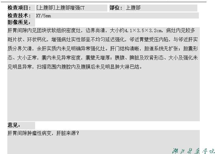 上腹部增强CT示:肝胃间隙内见团块状软组织密度灶,边界尚清,大小约4.1×3.5×3.2cm,病灶内见较多斑片状、环状钙化,增强病灶实性部分呈不均匀渐进性强化,邻近胃壁受压内陷,与邻近肝实质分界欠清诊断:肝胃间隙肿瘤性病变,胃来源?胃间质瘤可能。胃镜下表现为粘膜充血、水肿,散在出血点,诊断为慢性浅表性胃炎。