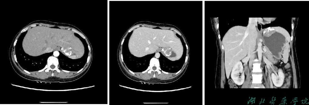 辅助检查:CT作为一种无创检查的方式,在诊断肿瘤方面具有许多不可替代的优势:它不仅能清晰显示病变位置,还能准确评价病变与周围组织或器官的关系;本病例肿块主要是呈外生性生长,向胃壁外生长,胃镜无法观察到胃壁向外生长的肿块,CT检查可以从横断面观察胃壁外生性肿块的位置,弥补了这一缺陷,此时CT检查便起到了重要的作用。CFT的特征性表现包括位于肿瘤中央或周围分布的钙化灶,表现为粗大的条状钙化或散在的沙粒样钙化,常常单发,边界清晰,增强扫描呈渐近性轻度至中度强化,增强前后CT特征主要根据胃CFT中梭形细胞、胶原、钙化、纤维成分和淋巴浆细胞炎性浸润的比例来确定。