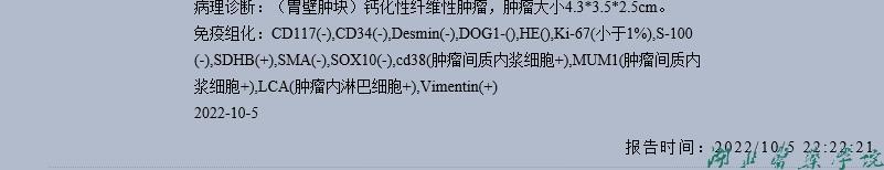 [11]李璐,王淑妍,邓茜,等.胃钙化性纤维性肿瘤24例临床病理分析[J].临床与实验病理学杂志, 2022, 38(02): 211-213.