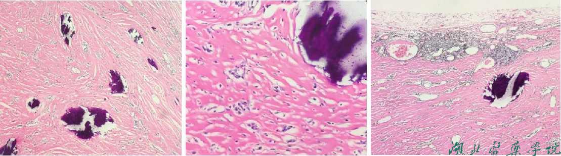 图3a)HE×100胶原化的纤维组织伴钙化;b)HE×400梭形卵圆核瘤细胞及炎细胞浸润;c)HE×100瘤周淋巴细胞聚集。