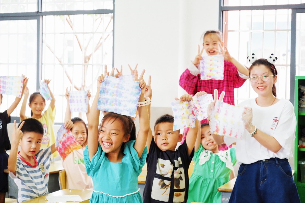 为了增强了同学们的民族自豪感和文化认同感,团队充分利用成员有汉族、瑶族、侗族、土家族等多民族的特色以及钟祥市当地有九里回族乡、赵庙村、柴湖镇等地多民族聚居的特点向孩子们介绍了我国丰富的民族文化。展开如漆扇体验、中国结编织、土家族蜡染讲解以及扎染体验等民族文化传承课程且鼓励班级各民族学生做小老师为大家分享自己的民族文化,增强他们对民族文化的自信与对传统文化的了解和认同,体验传统工艺的乐趣。