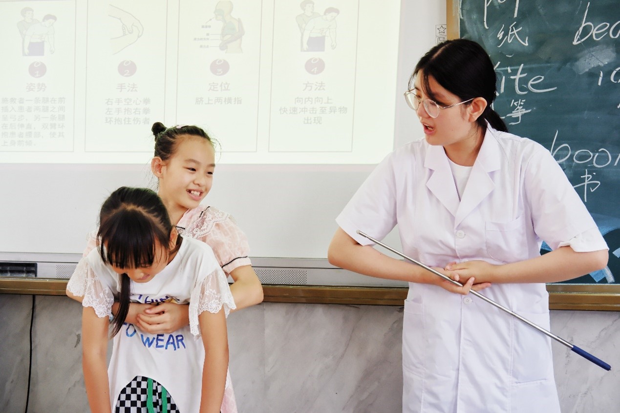 “医治别人,不如将急救技巧授予别人,让更多宝贵的生命受到保护。”橙红的队员们运用和转化业务技能,发挥专业优势,为同学们带来医学类课程。课堂上,志愿者们深人浅出地讲解了环行包扎法、螺旋形包扎法、8字包法、三角巾包扎法。此外团队还邀请了当地公安警察开展了防溺水,防诈骗,交通安全和禁毒防毒的综合安全教育。让医学种子与人民至上,生命至上的思想在学生们心中发芽,为祖国未来夯实健康的基础。