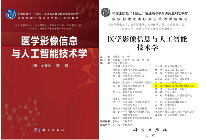 本网讯(通讯员 安娜)我院教师陈文参编的科学出版社“十四五”普通高等教育研究生规划教材《医学影像信息与人工智能技术学》于2024年10月正式出版。这部教材是医学影像技术研究生的核心课程教材,也是我校长期以来在教学实践中坚持研究创新,坚持教学改革、积极参加教材建设而取得的成果。