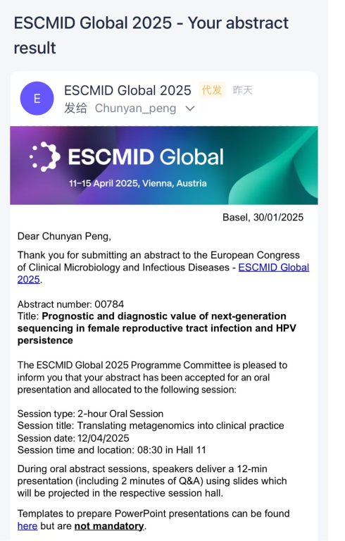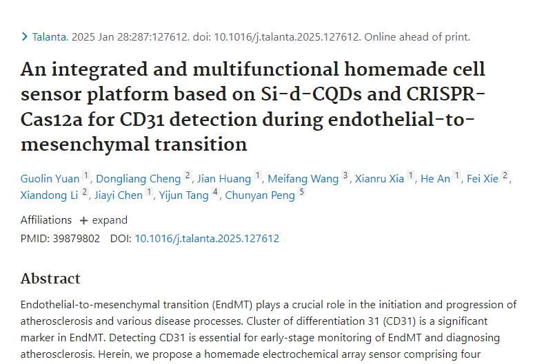 彭春艳教授团队在中科院一区top期刊Talanta(IF=5.6)发表了题为“An integrated and multifunctional homemade cell sensor platform based on Si-d-CQDs and CRISPR-Cas12a for CD31 detection during endothelial-to-mesenchymal transition”的研究论文,该成果是关于心血管标志物检测方法学的研究。同时,彭春艳教授团队在第35届欧洲临床微生物学与感染病学大会(ESCMID Global 2025)的投稿也获大会口头发言的机会。据悉,欧洲临床微生物学与感染病学大会(ECCMID)由欧洲临床微生物学与感染病学会(ESCMID)主办,是临床微生物学、感染性疾病和感染控制领域极具影响力的国际会议。