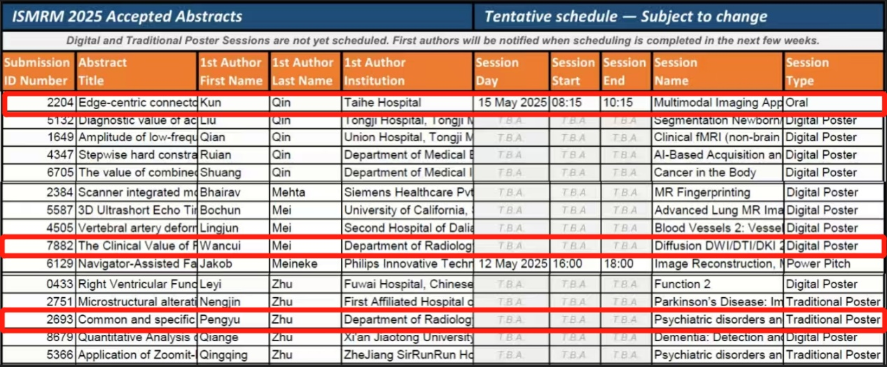 陈文教授团队在2025国际医学磁共振学会(International Society for Magnetic Resonance in Medicine,ISMRM)共有3篇高质量研究成果成功入选,其中我院研究生梅莞翠和朱鹏雨分别获Digital Poster和Traditional Poster展示交流机会。此次投稿的成果是医学影像学与精神科学、肿瘤学等领域的深度整合,是陈文教授团队跨学科科研合作的结晶,为推动精准医疗和个性化治疗的广泛应用奠定了坚实基础。ISMRM作为全球最大规模、最具权威性、代表性的医学磁共振学会,同时也是放射影像领域最具影响力的专业学会之一。据初步统计,2025年共10452篇摘要,摘要录用率约为48.9%,其中Oral共795篇,录用率约为7.6%,Power Pitch共524篇,录用率约为5%,Digital Poster共3241篇,录用率约为31%,Traditional Poster共554篇,录用率约为5.3%。