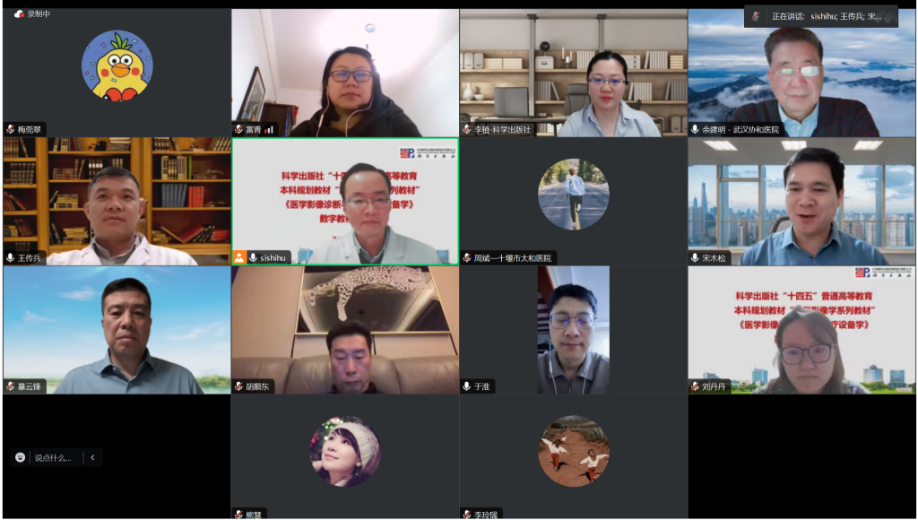 本网讯(通讯员 周斌)为高质量推进普通高等教育本科规划教材建设,近日科学出版社“十四五”普通高等教育本科规划教材“医学影像学系列教材”《医学影像诊断与放射治疗设备学》数字教材研讨会于线上召开。会议由《医学影像诊断与放射治疗设备学》数字教材第一主编、我校生物医学工程学院陈文教授主持,科学出版社“十四五”规划教材“医学影像学系列教材”编审专家委员会主任委员暨《医学影像诊断与放射治疗设备学》纸质教材第一主编余建明教授、科学出版社高等医学教育分社李植老师和该书各章节编委负责人参会。